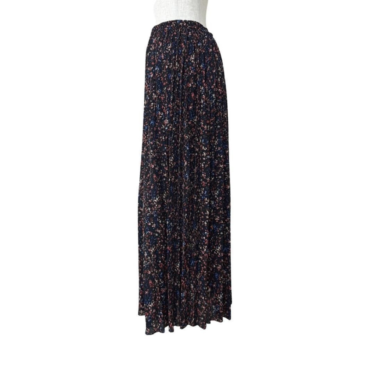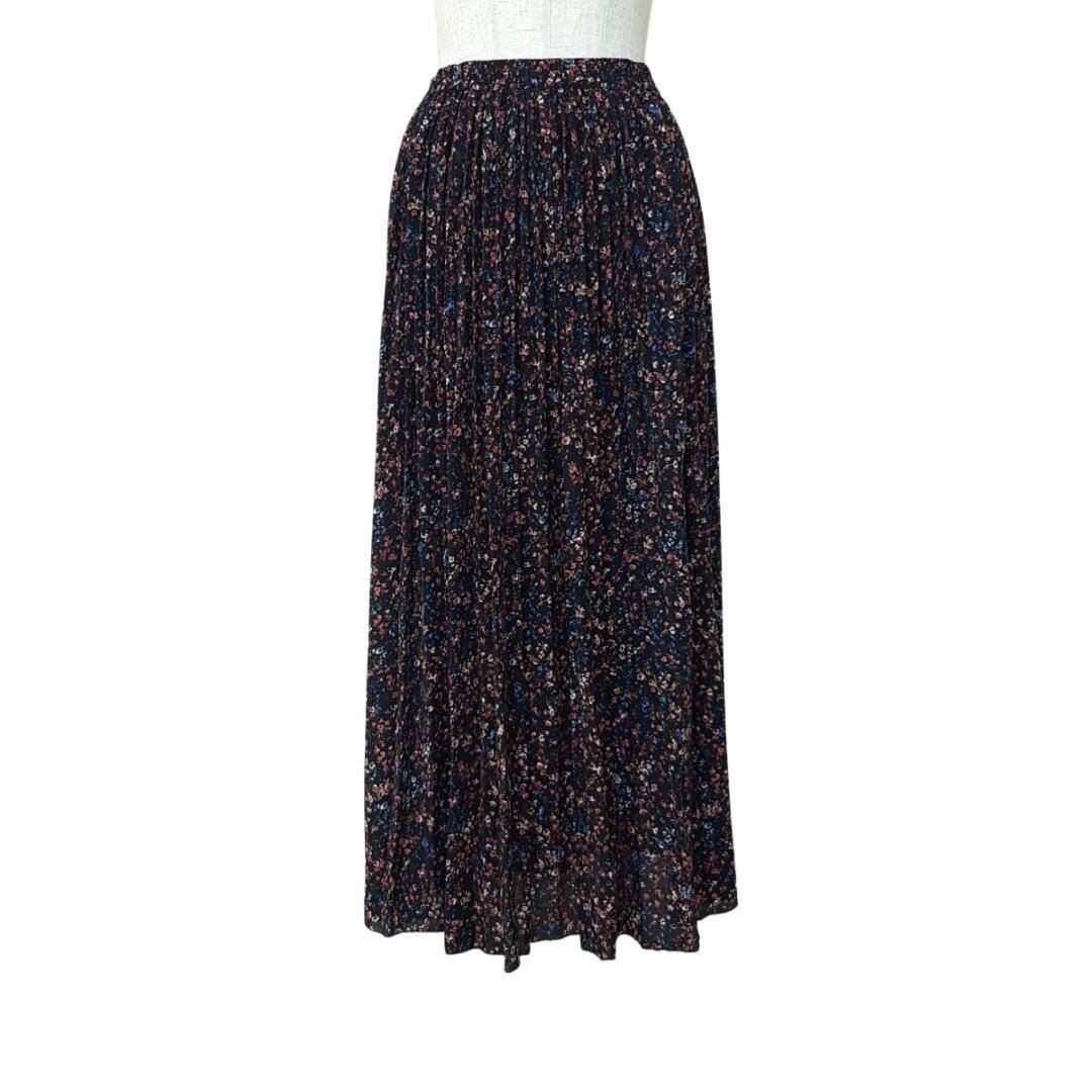 ランダムドット柄と小花柄をプリントしたロングフレアスカート。美しいドレープ感が魅力のしなやかなデシン素材を使用。